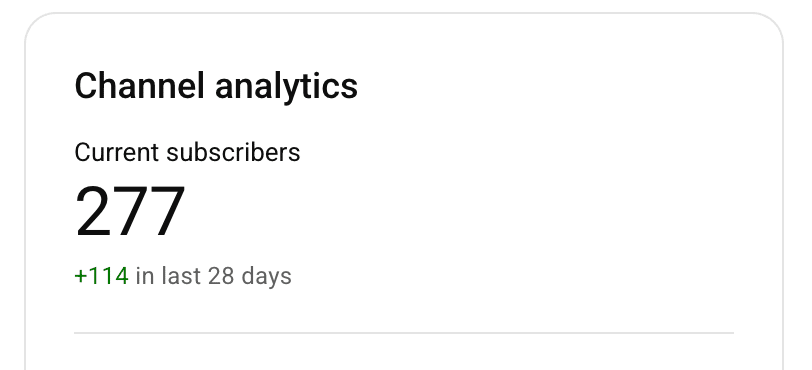 It's already the end of October, Reader (!!), β And the weird liminal space that is the end of 2025 continues. πΆβπ«οΈ At least that's how I've been feeling. It feels like floating in space, directionless, yet oddly peaceful. πͺ And yet, I'm also finding more and more things to be grateful for, and excited for what's to come. For example, as we speak I have 277 subscribers on YouTube. π₯³ It might not sound like much, but look at these stats! 114 new subscribers in the last 28 days! That's inching closer and closer to HALF of my subscribers finding me in just the last month. This comes after over a year of consistent (ish) posting to YouTube, both short and long-form videos. It's a small confidence boost that the Health First Freelancer message is reaching more and more of the right people. And I hope it's a reminder to you that progress takes time. It took me 14 months of persistent, if not entirely consistent, posting to get this snowball rolling down the hill. You might be on a similar journey with your business, or your health, or both. But eventually, you WILL reach a tipping point, where you stop pushing the snowball up the hill, and it starts to roll down the other side on its own momentum. The trick is not to stop before you reach that tipping point. (Unless your intuition is truly screaming at you to pivot in another direction, which does happen.) If you're still holding the vision for a freelance business that supports your health and allows you to live the lifestyle you dream of, then keep going. π And let me know, what kind of support are you most needing right now as we wrap up 2025 and look ahead to the new year? I would love to hear from you. β β See you on the other side β·οΈ, Amanda β P.S. This is by far my most popular YouTube Short, with over 60k views! That's pretty crazy. I guess a lot of people are interested in high dose vitamin D βοΈ π€·ββοΈ